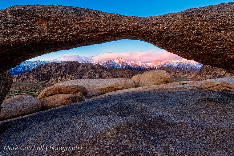 I found Mobius Arch next. The view through it was beautiful as the sun lit up Lone Pine Peak.